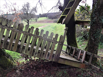 Later, Lady M called me to look at some damage nearer to home. 'Dangerous Fun' had totally collapsed. Over the years, the trees have grown and the structure has been pulled apart; the strong wind did the rest. It's been there since 2013, so it's served us well. It'll serve us again now as firewood, unless I can find some other use for what's left.